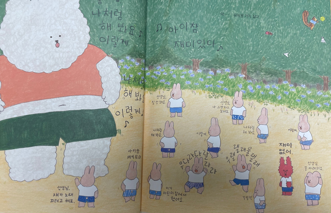 그림책을 자세히 보면 주인공 아이뿐 아니라 다른 아이들도 저마다 뭐라고 재잘재잘 이야기 하고 있는 것을 볼 수 있다. 미술시간에 당근을 그리던 아이는, 선생님이 "왜 당근을 그렸어요?"라는 말에 "당근이 되고 싶어요."라고 말한다. 순간 어렸을 때, 남동생이 "커서 경찰차가 되고 싶다"는 말한 것을 떠올리곤 작가님의 동심에 대한 통찰력에 깊이 감탄했다. 경찰도 아니고 경찰차가 되고 싶다니. 아이들의 애정 표현은 이 정도로 직설적이다.
