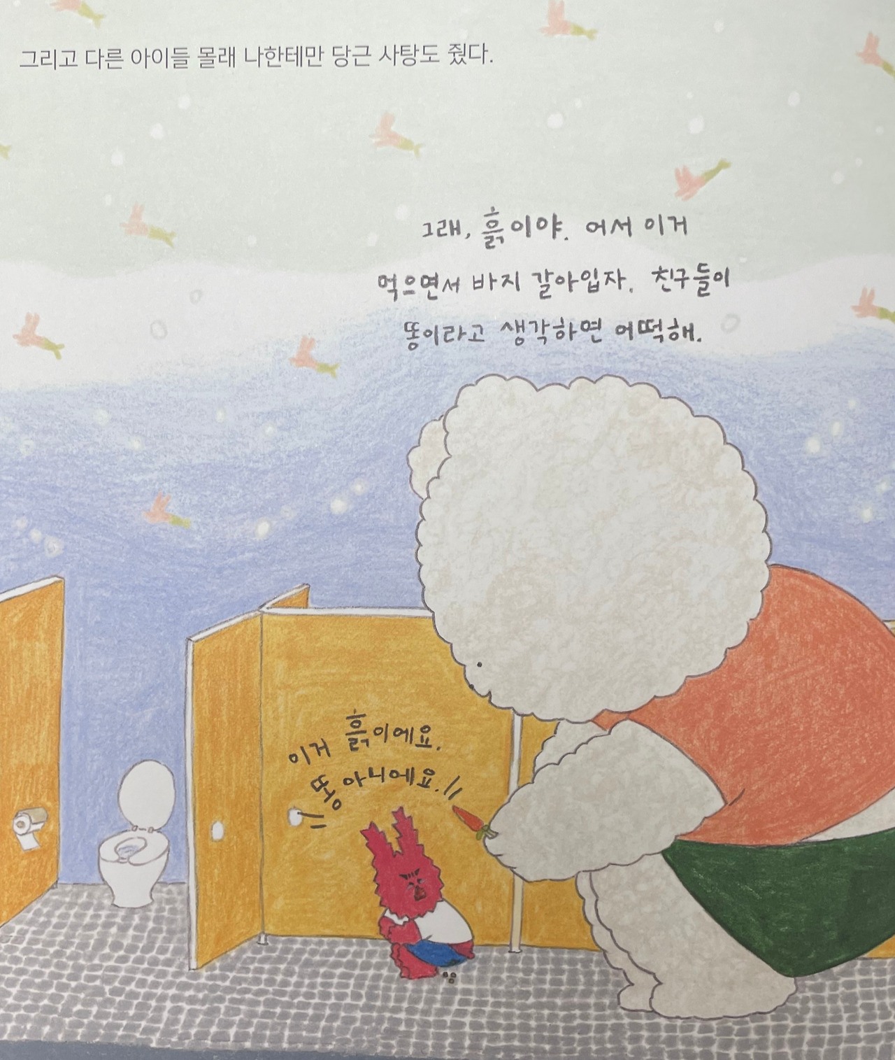 독서 모임에 서로의 책을 교환하는 시간이 있었다. 내가 가져간 것은 『당근유치원』. 귀여운 표지 때문에 인기가 많았던 이 책은 금방 새 주인을 찾았고, 예기치 못하게 그녀를 울렸다. 바지에 실수를 하곤 '똥이 아니라 흙'이라고 우기는 아이를 감싸주는 선생님의 태도에서 진정한 사랑의 태도를 느껴서라고.