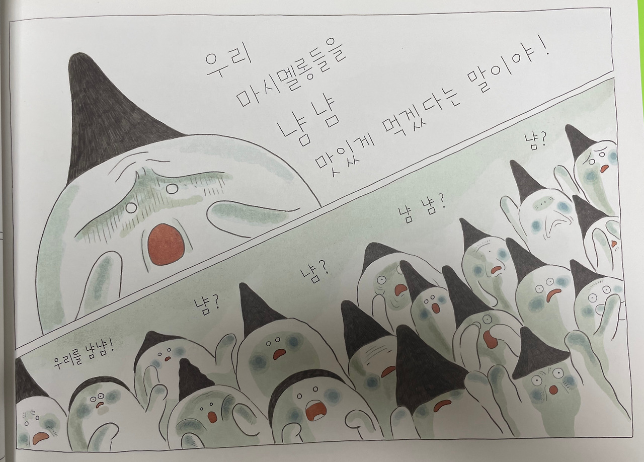 이전까지는 작가가 어떤 의도를 가지고 썼는지 쉽게 알아차릴 수 있는 그림책들을 읽었기에, 메시지보다 철저히 유희적인 요소와 귀여운 요소(ex. 존재 자체가 귀여운 마시멜롱)에 초점을 맞춘 그림책은 신기하게 느껴졌다.