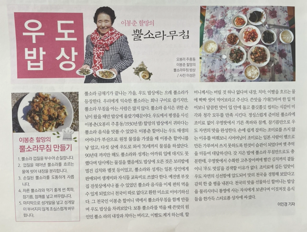 이밖에도 나름 탄탄한 구성으로 다양한 코너가 담겨 있었는데 '우도밥상'이라는 이름의 코너에서는 마을 주민 한 명의 인터뷰와 그가 잘 만드는 음식 레시피(소라무침, 땅콩강정 등) 정보를 얻을 수 있었고 '그땐 경허멍 살아수다(그땐 그렇게 살았지요)'라는 코너에는 옛날 사진과 함께 우도 주민들의 이야기가 실려 있었다.