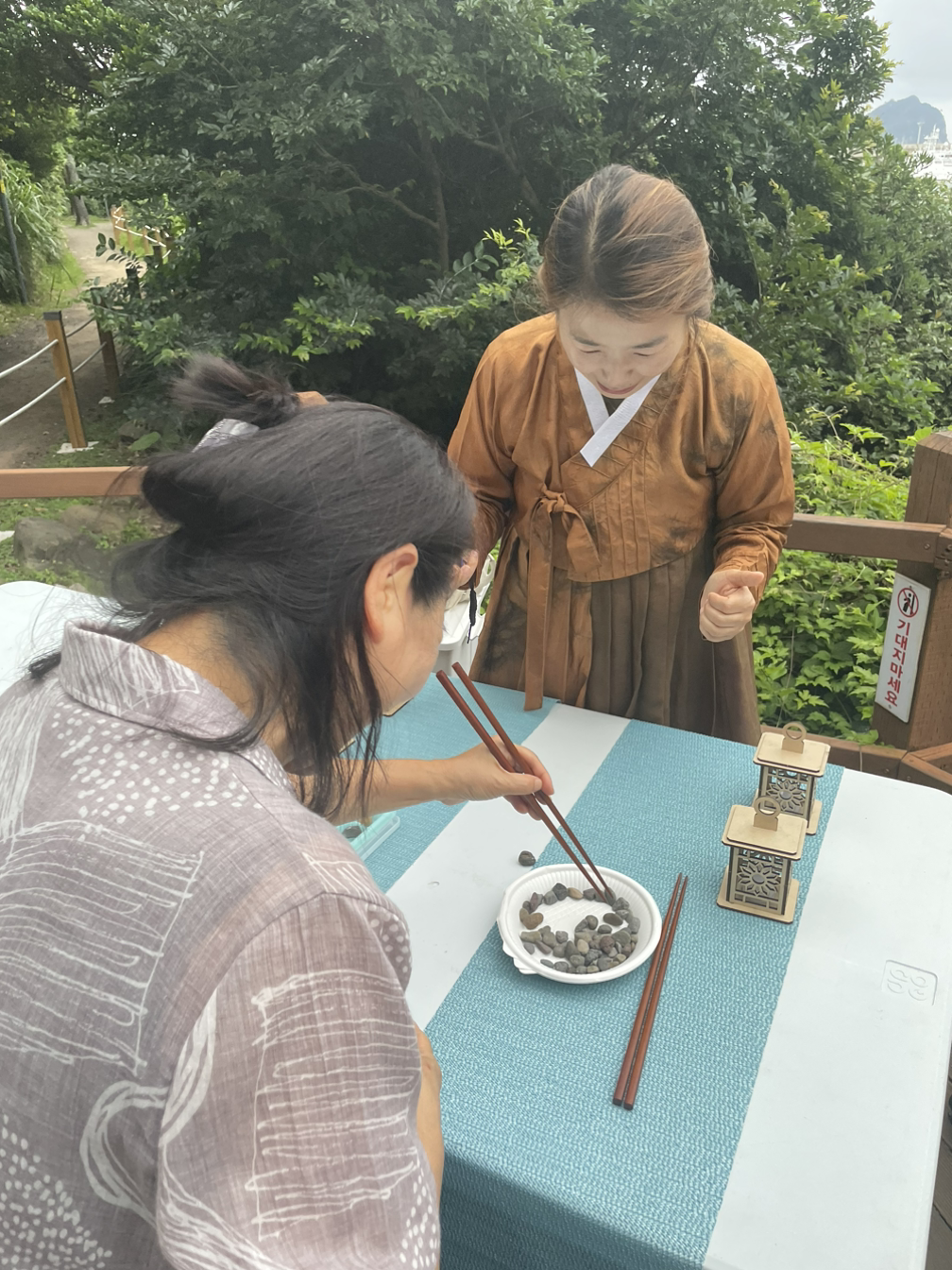 산책로를 조금 더 걸어가서 참여한 다음 미션은 젓가락으로 현무암 돌멩이 옮기기로, 1분 안에 10개의 작은 현무암 돌멩이를 들어 통에 옮겨야 했다.