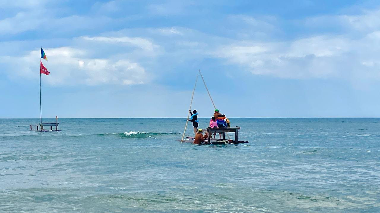 보트로는 5초 만에 갔을 바닷길을 어르신들이 나무배를 밀고 끌며 5분여 넘게 가는 모습을 배 위에 타서 지켜보고 있으니 나이 든 부모님의 등에 철없이 올라탄 장성한 자녀처럼 느껴져 절로 숙연해졌다. 설상가상으로 같이 탄 아이들은 어색해서인지 겁이 나서인지 얼굴이 굳어 있어서 테우 위에는 전반적으로 어색한 분위기가 흘렀다.