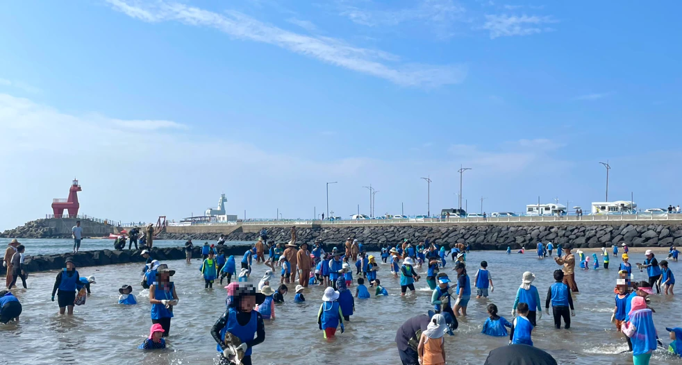 그나마 잠시 후 원담 고기잡이 체험 시간이 되니 해수욕을 하던 사람들이 하나둘 모여들었다.