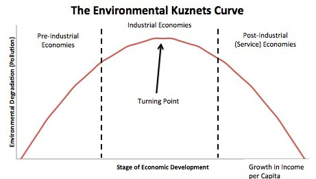 쿠즈네츠라는 학자의 이론을 본 따 명명된 쿠즈네츠 곡선(Kuznets Curve)은 1인당 GDP가 높아질수록 한 나라의 개발 초기에는 환경이 악화되다가, 일정 시점이 지나면 환경오염이 개선되는 현상을 설명하고 있다. 국가가 경제발전을 하는 초기에는 환경파괴가 진행되다가, 일정 시간, 즉 터닝포인트(turning point)가 지나면 일단 삶의 질이 높아져 환경에 투자를 할 수 있는 여유가 생겨, 환경오염이 개선된다는 이론이다.