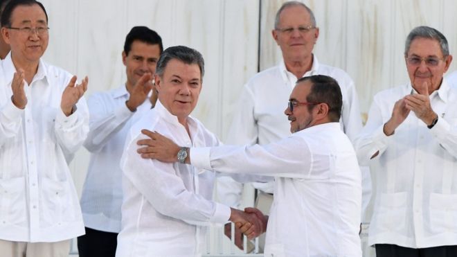 그 이후, 쿠바 하바나에서의 4년 간의 지난한 협상 끝에, 2016년 12월에 콜롬비아 정부는 FARC와 평화협정을 맺었다. 핵심은 FARC를 공식 정치단체로 인정하는 것이었다. 이 협상 끝에 FARC는 모든 무기를 정부에 반납했다. 협정 수립에는 난관이 많았다. 국민투표 후 나라는 반으로 갈라졌고, 실제 협정의 이행은 2017년 중반에서야 시작됐다.