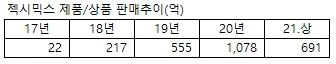 젝시믹스의 매출 성장세가 뚜렷합니다. 17년 22억에서 20년에는 1,078억으로 성장했고 21년 상반기에는 691억 매출실적을 기록했습니다.