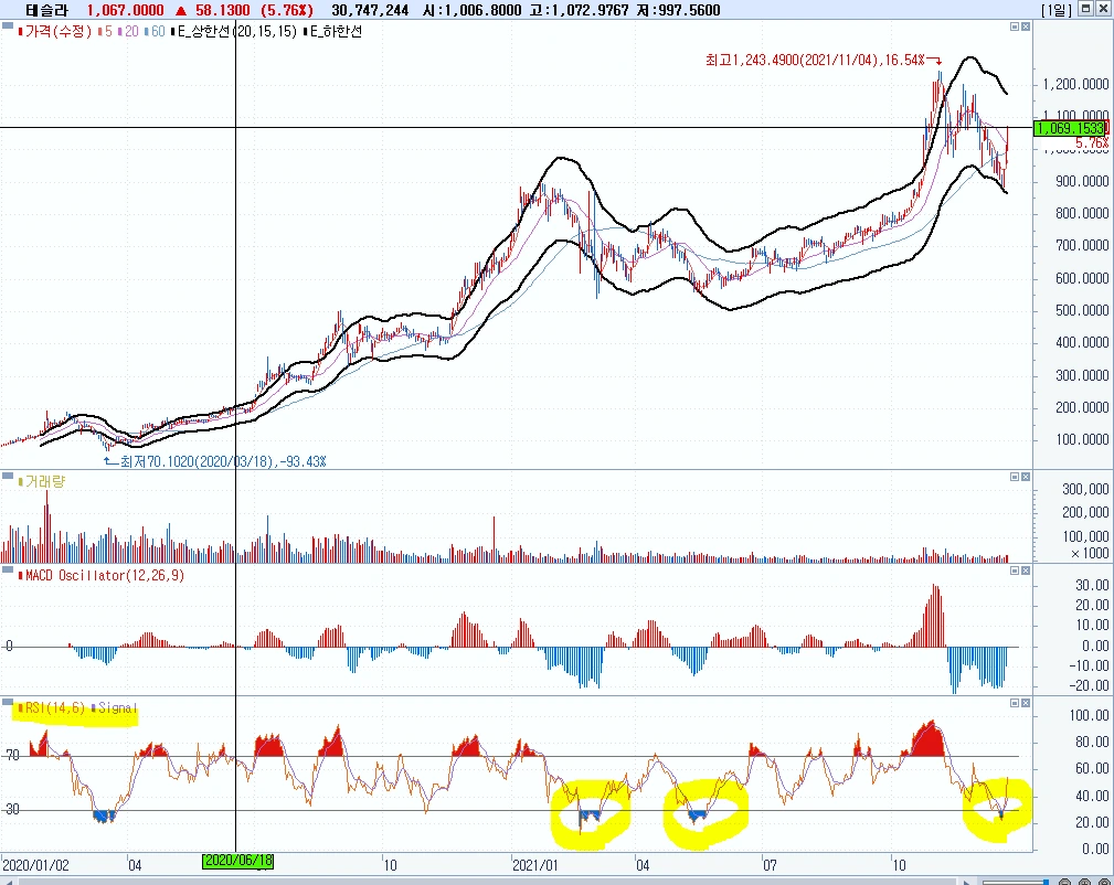 두 번째는 RSI 지표입니다. RSI 아닌 과매도 과매수 구간을 과거 경험적으로 확인해 볼 수 있는 통계적 기표입니다. 상승 압력과 하락 압력을 수치화한 지표로 생각보다 계산방법도 단순하고 HTS와 MTS에서 기본적으로 제공하는 지표입니다. 이번 조정기간에서는 RSI(14,6) 모니터링 결과 30을 하회하는 모습이 나왔습니다.