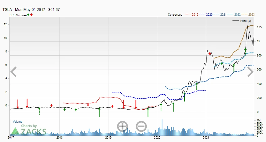 밸류보다는 내러티브가 강조되는 성장기업이긴 하지만 이익도 안정적으로 증가하고 있습니다. 특히 미래 이익이 성장하는 만큼 주가도 성장하고 있어 주가 성장만 가파르다고 볼 수 없습니다. 오히려 이익이 증가가 예상되는 만큼만 주가도 상승하고 있는 모습입니다. 더구나 2020년 이후에는 실적 Surprise를 연속적으로 보여주고 있습니다.