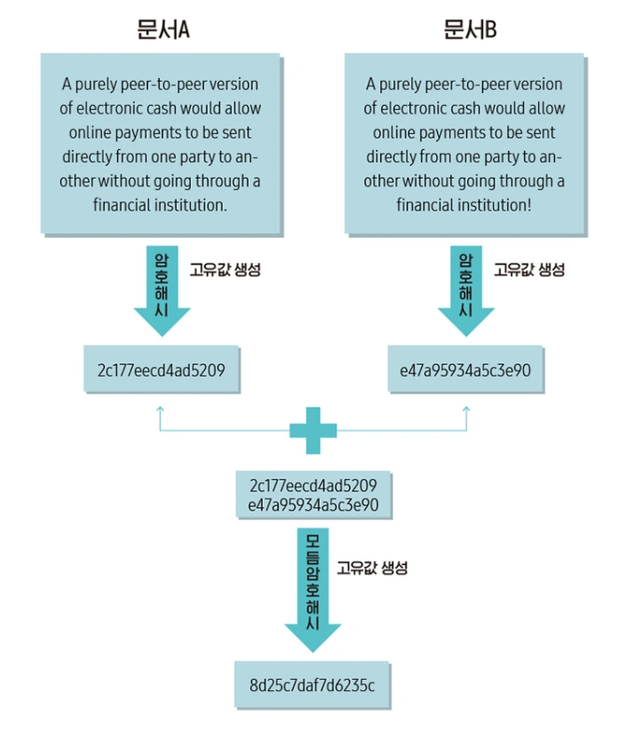 하지만 '8d255asf654456c1231e'로 Hello를 알아낼 수는 없습니다. 그래서 일방향적입니다. 쌍방향으로 소통할 수는 없죠. 다만 모든 참여자들이 '8d255asf654456c1231e'를 가지고 있기에 어떤 블록이 진짜인지 가까인지는 판단할 수 있게 됩니다.
