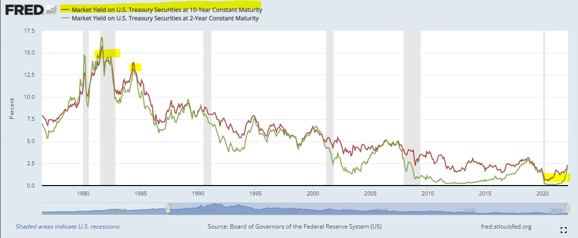 그러나 과거와는 달리 금리인상의 초입부터 장단기 금리차 역전에 대한 이슈가 불거지고 있습니다. 이는 과거와는 달리 10년물 금리가 꾸준히 우하향하여 정책적으로 금리를 상승할 수 있는 운신의 폭이 작아졌기 때문입니다. 다른 말로 하면 장기 경제성장률이 낮아진 상황에서 약간의 긴축만으로 경기 침체가 올 수도 있다는 염려입니다. 현재 10년물 금리는 2.34%로 1980년 이후 꾸준히 하락하는 모습을 보이고 있습니다.