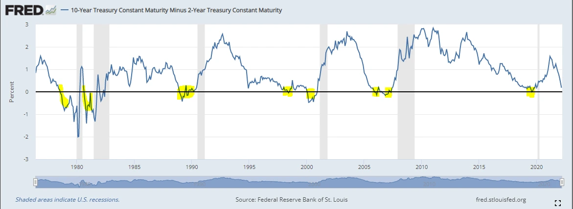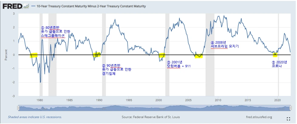 1980년 이후의 큰 폭의 경기침체 및 주가 하락의 사례는 크게 다섯 번입니다. 그리고 이들 모두의 경기침체 1~2년 전 장단기 금리의 역전을 경험했습니다. 이론적으로도 과거 사례로도 장단기 금리차 역전은 시장 참여자들의 마음을 불안하게 만들기에 충분한 데이터입니다.