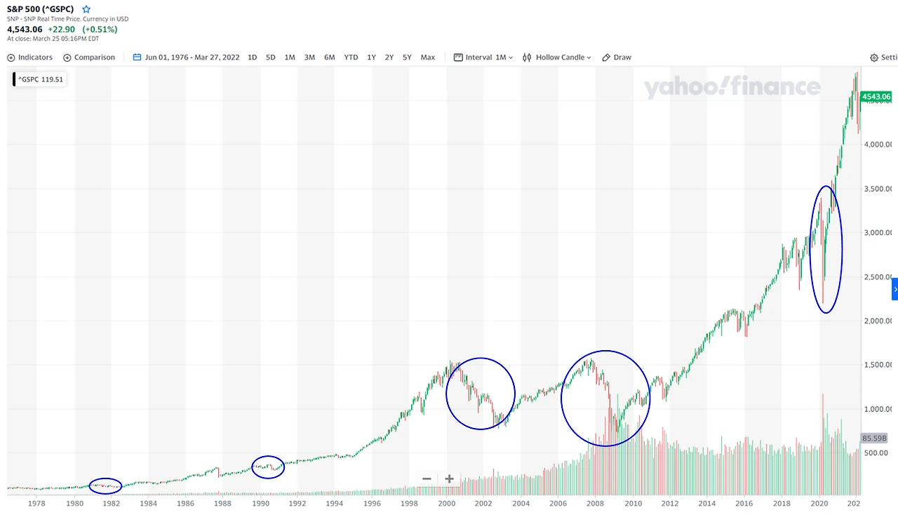 과거 사례를 보면 장단기 금리차 역전으로 경기침체가 곧장 이어지지 않았습니다. 1~2년 시차를 두고 경기침체가 왔고 주가도 큰 폭으로 조정되었습니다. 또한 하락하더라도 결국 주가는 우상향 했고, 매수매도의 타이밍을 잘못 잡는다면 내가 판 가격보다 높은 가격에 다시 매수해야 할 수도 있습니다.