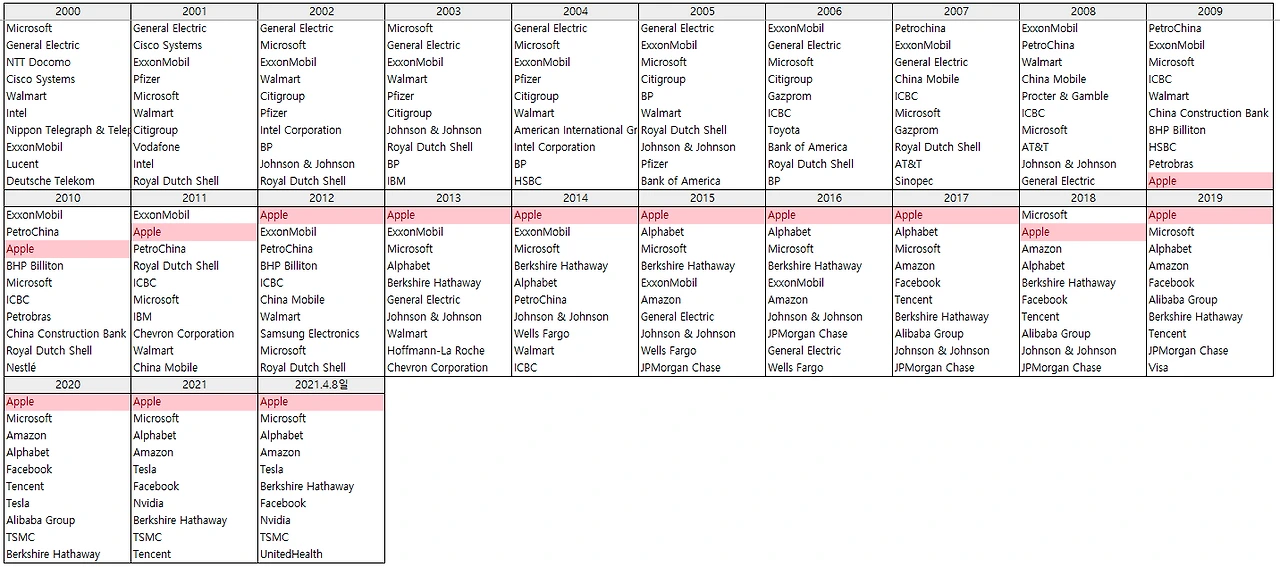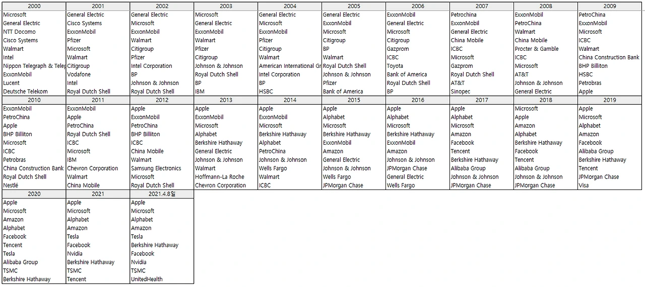 2000년 1위 기업은 마소였습니다. 당시 10위 안에 리스트 된 기업은 2위 GE, 3위 NTT Docomo(일본), 4위 CISCO, 5위 월마트, 6위 인텔, 7위 Nippon Telegraph & Telephone(일본), 8위 엑손모빌, 9위 Lucent, 10위 Destsche Telekom(독일)입니다. 현재 시총 기준 10위를 유지하고 있는 기업은 마소가 유일합니다.