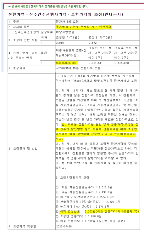실제로 전환된다면 부담스러운 물량입니다. 기존 주주 입장에서 굉장히 부담스러운 채권임에는 틀림이 없습니다. 그러나 이 리픽싱 가격에는 최초 발행가 70%까지만 조정이 가능합니다. 즉 2,203원(3,147원 x 70%)이 한계 가격인 것이죠.