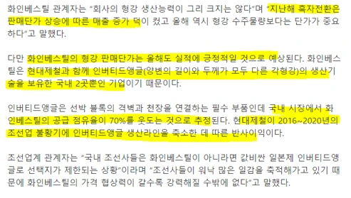 즉 조선 수주량은 과거 수준을 회복해가고 있지만 인버티드 앵글의 생산 규모는 감소한 상황으로 판매가는 증가할 것으로 예상됩니다. 국내 조선사들은 화인베스틸이 아니면 가격이 비싼 일본제 인버티드 앵글로 선택지가 제한되는 상황입니다.