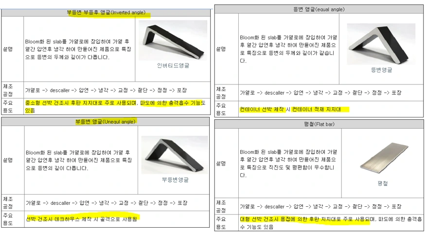 선박 건조에 필수적인 앵글을 제작합니다. 쇳물이 굳어진 평평한 철판인 Slab를 포스코에서 구매하고 구매한 철판을 조선용 기자재에 맞게 열간 압연하여 앵글을 만들게 됩니다. 인버티드 앵글로 주로 불리는 이 기자재는 선박 건조에 필수적인 지지대 역할을 수행합니다. 사진만 보면 단순히 구부러진 철판이라고 생각하기 쉽습니다. 그러나 이 앵글의 규모는 6~20m로 엄청나게 큰 철판이며, 각각 고객사에 요청에 맞춰 다르게 생산됩니다.