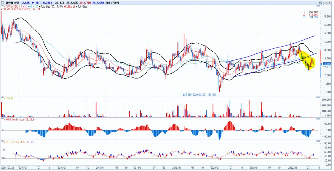 누군가가 의도적으로 가격을 내리려고 한다면 최대 내릴 수 있는 가격은 2,200원입니다. 실제로 지난달 화인베스틸에 주가는 2,200원까지 도달했고 현재는 소폭 올라 2,600원 수준입니다. 리픽싱 최대 조정가격 2,200원과 현재 전환사채 전환가 2,572원은 일반 주주들에게도 손해 보는 가격은 아닐 수 있습니다.