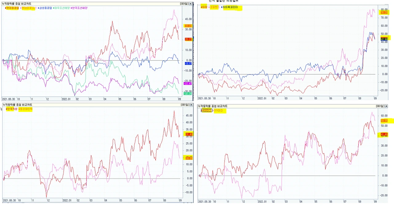 조선사 중에서는 현대중공업/현대미포, 피팅밸브 업체 태광/성광벤드/하이록코리아, LNG 보냉재 업체 한국카본/동성화인텍, 엔진 제작업체 HSD엔진/STX엔진입니다. 이중 실제로 2분기 실적이 눈에 띄게 좋아진 종목은 피팅밸브 업체뿐입니다. 다른 기업들은 적자폭을 줄였거나, 앞으로의 기대감으로 상승했습니다.