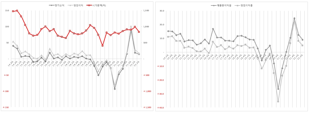 이에 이익 및 이익률 개선되고 있습니다. 21년 하반기 흑자전환에 성공했고, 2분기 이익률은 5%대로 올라왔습니다. 조선업 업황이 개선되는 만큼 이익과 이익률 개선을 기대해 볼 수 있습니다. 한편 다행스럽게도(?) 주가는 여전히 제자리입니다. 상반기 영업이익은 45억, 순이익은 33억을 벌었으나, 시총은 여전히 800억입니다.