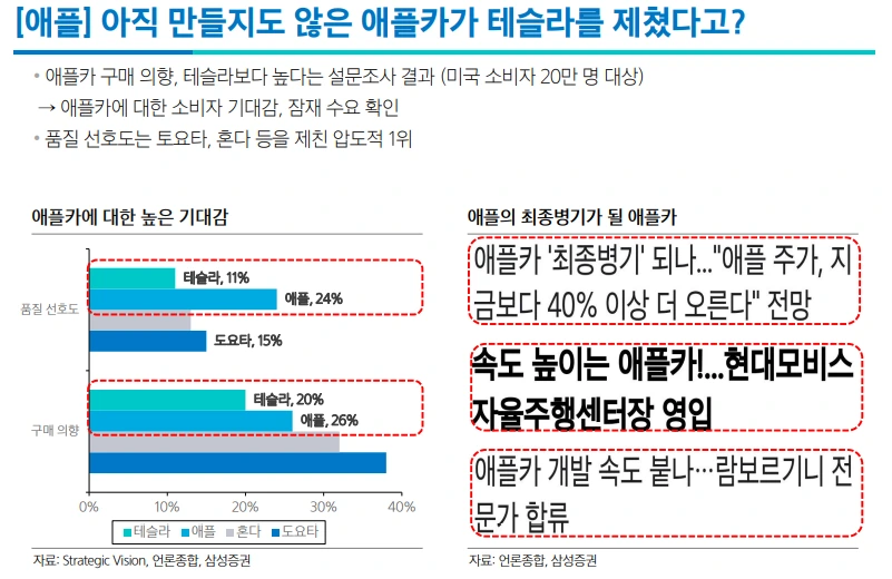 애플에 대한 기대감은 애플VR을 넘어 애플카로 이어지고 있습니다. 애플에서는 공식적으로 애플카를 언급한 바가 전혀 없습니다. 그래서 디자인도 품질도 성능도 어느 것 하나 알려진 바가 없습니다. 그러나 최근 한 설문조사 결과에 따르면 애플카에 품질 선호도가 테슬라와 도요타를 제쳤고, 구매 의향도 테슬라를 제쳤습니다. 대단한 애플의 브랜드 파워입니다.