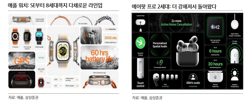 아이폰 이외에도 애플워치 울트라, 에어팟 프로 2세대가 출시되었습니다. 애플워치 울트라는 799달러, 에어팟 프로는 249달러로 웨어러블의 ASP는 상승할 것이라 예상되며, 발표 마지막 티저에는 애플VR에 힌트를 제시하며 기대감이 커진 상황입니다. 마치 마블 영화 마지막 클립 영상처럼 VR에 대한 힌트를 제공하고 있습니다.