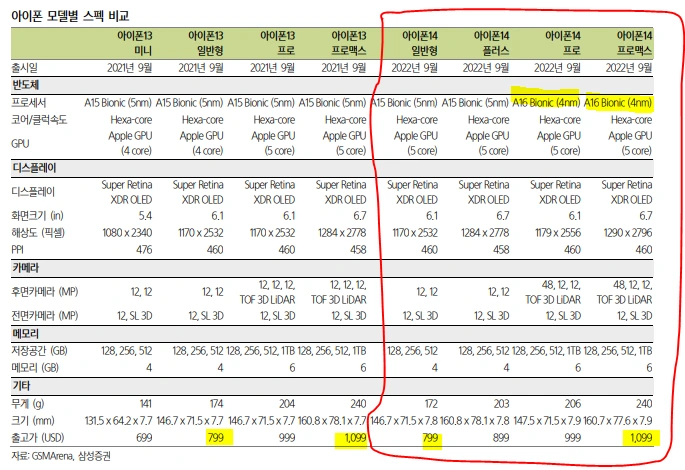 프로 모델의 성능이 강화된 것도 직전 모델과의 차이입니다. 그간 프로 모델과 일반 모델의 차이는 카메라 정도에 불과했으나, 이번엔 AP부터 차별화를 두었습니다. A16 프로세서는 프로 모델에만 추가됐습니다.
