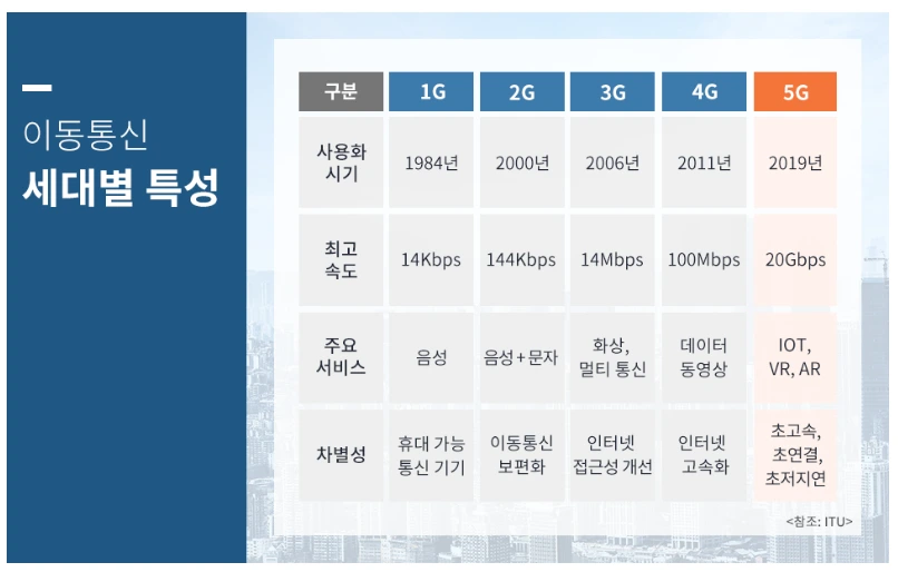 5G : 음성+SMS+초고속인터넷+실시간동영상 +IOT+자율주행