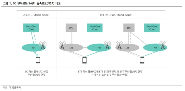 국내 통신사들이 이런 방식을 채택한 이유는 속도입니다. 대한민국은 5G를 세계최초로 상용화하기 위해 기존에 있던 인프라를 재활용하는 방식을 채택합니다. 기존의 4G 네트워크 망에 5G 기지국을 연결하는 형태로 5G를 상용화한 것이죠. 이를 NSA방식(Non-Stansd-Alone)이라고 합니다.