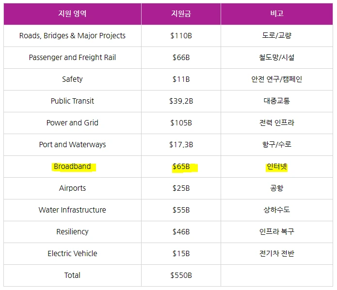 미국에서는 IRA에 이어 IIJA법안이 2021년 11월 미의회를 통과했습니다. 23년 하반기부터 본격적으로 집행될 예산입니다. 총규모는 550B 달러이며 이 중 인터넷 관련 투자는 65B 달러입니다. 브로드밴드 미설치 지역 커버 및 낙후 지역 속도 개선 등이 포함되어 있으며 최소 다운로드 속도 100 Mbps 및 업로드 속도 20 Mbps 가 목표인 만큼 5G 투자가 필수입니다.