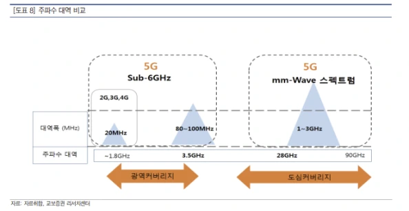 통신사들이 사용하는 5G 주파수는 3.5~7 GHz로 외국에서는 Sub6라고 불리는 영역입니다. 결론부터 말하자면 이 부분은 4세대 이동통신인 2.5 GHz와 큰 자이가 없습니다. 그렇게 때문에 핸드폰에서 체감하는 5G와 LTE의 차이가 크지 않은 것입니다.