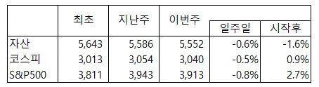 왼쪽의 표는 포트폴리오, 코스피지수, S&P500지수를 순서대로 정리한 표입니다. 한 주간 변동을 보면 제 자산은 국내와 미국 시장만큼 하락한 모습입니다. 투자 기록을 시작한 시점부터는 시장을 이기지 못하고 있는 모습이네요.