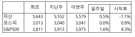 이번 주 자산은 소폭 증가하였으나 큰 변화는 없습니다. 코스피는 보합, 미국은 1.6프로 상승하는 한주였습니다. 미국의 FAANG주종목이나 나스닥, 국내의 2차 전지 등 낙폭이 과대했던 종목들도 어느 정도 바닥을 잡아가는 듯한 모습입니다. 다음 주는 어느 정도 시장 반등을 기대해 보겠습니다.