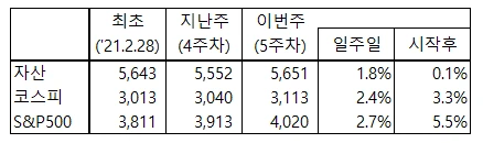 이번 주 자산은 1.8% 증가했습니다. 코스피가 3100선을 다시 상회하여 마감됐고, S&P는 4000선을 넘으며 신고가를 기록했습니다. 상승장이 지속되는 모습입니다. 비록 시장 상승률을 넘어서는 자산 상승은 없었습니다. 그래도 시장과 방향을 함께 하고 있는 것은 다행이라고 생각합니다.
