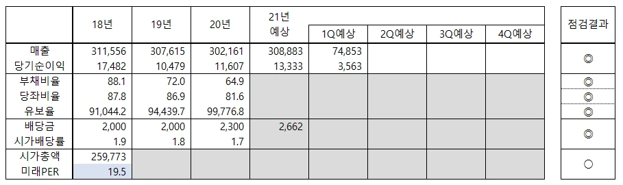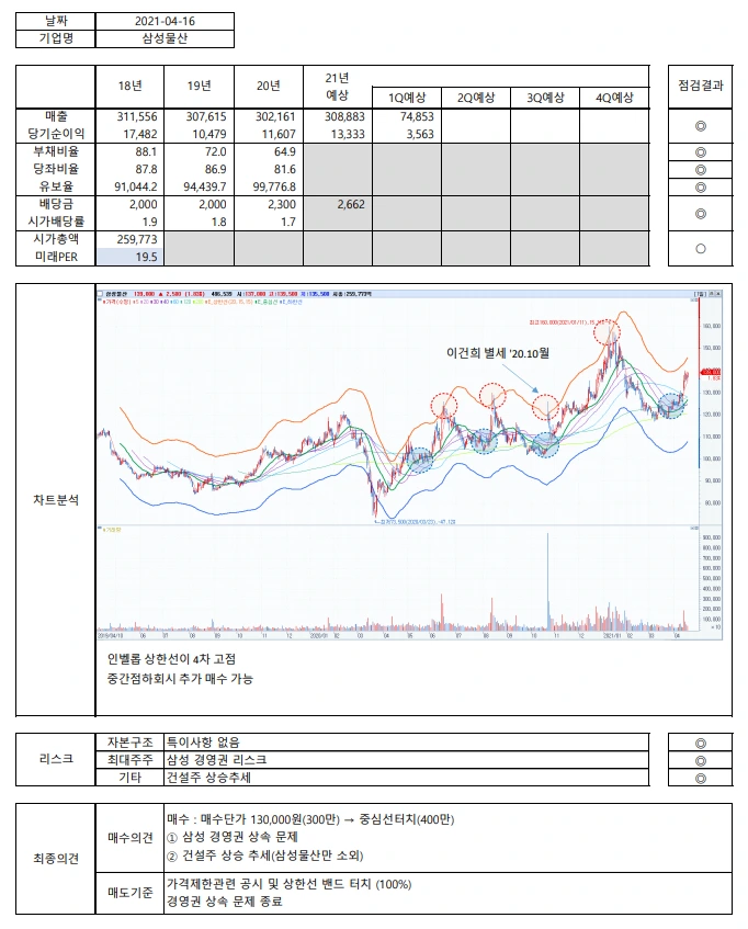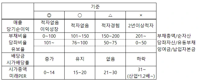 점검결과의 기준은 ◎ 매우 양호, ○ 양호, △ 보류, × 탈락 네 가지입니다. 각각을 판단하는 기준은 산업과 종목마다 조금은 달라져야겠지만 삼성물산을 판단한 기준은 아래와 같습니다. "× 탈락" 항목이 있으면 매수 종목에서 제외하겠습니다.