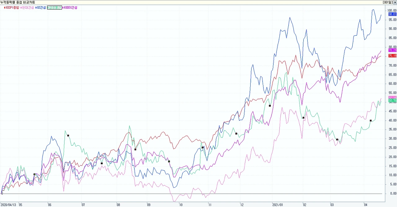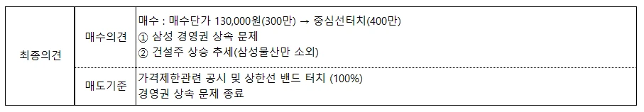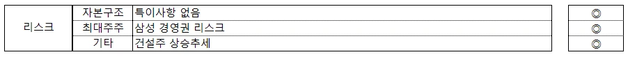 유상증자 및 전환사채로 인한 자본 희석 리스크가 없고, 최대주주 지분 매도 이슈도 없습니다. 다만 삼성 경영권 관련된 리스크는 변동성을 키울 수 있습니다. 추가적으로 건설주가 상승하고 있습니다. 현대건설, GS건설, KODEX 건설의 주가를 보면 52주 신고가를 내면서 우상향하고 있고, 삼성물산은 건설주 내에서 상대적으로 많이 상승하지 않았음을 관찰할 수 있었습니다.