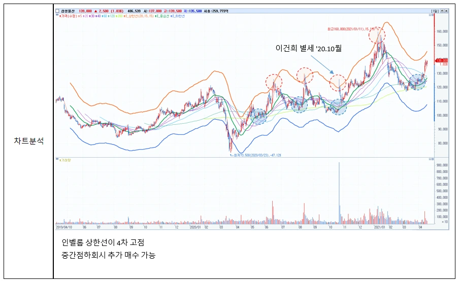 차트 트렌드를 분석한 결과입니다. 삼성물산의 경우 인벨롭(15,20,20) 선 상단을 터치하고 하락했고 중간점 부근에서 하회했음을 알 수 있습니다. 특히 '20.10년 삼성가의 상속문제가 불거진 이후 주가가 크게 상승했고 현재 많이 낮아진 부근에서 재상승중입니다.
