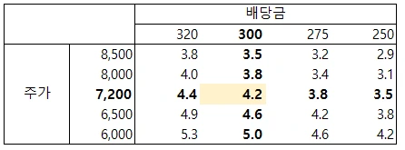 현재 금액 기준 배당수익률은 4.2%이며 주가가 8500까지 상승하더라도 기대되는 수익률은 3.5% 수준입니다. 3.2%~5.0%까지 배당수익률을 기대해봐도 좋을 것 같습니다.