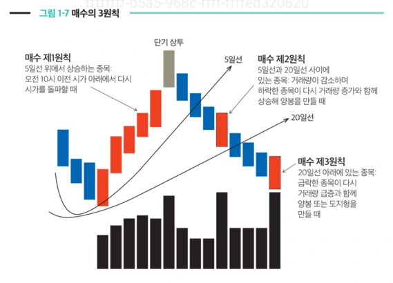 - 매수2원칙 : 5일선과 20일선 사이에 있는 종목, 거래량이 감소하며 하락한 종목이 다시 거래량 증가와 함께 상승해 양봉을 만들 때