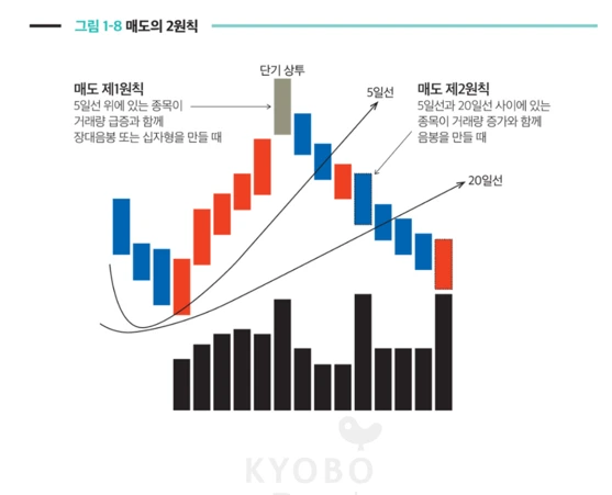 - 매도1원칙 : 5일선 위에 있는 종목이 거래량 급증과 함께 장대음봉 또는 십자형을 만들 때