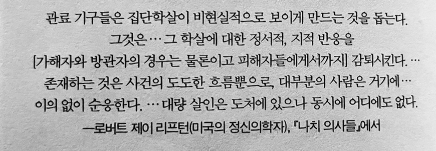 우리나라가 선진국 반열에 오른 지금, 이제는 보기 싫은 현실도 똑바로 봐야할 필요가 있다. 우리의 도덕성이 무너질 것이 염려되어 진실을 마주하지 않는 것을 선택한다면, 그것 또한 대량학살이 일어나는 것을 어렴풋이 알면서도 더 알아가기를 포기한 ‘선택’이라고 할 수 있다.