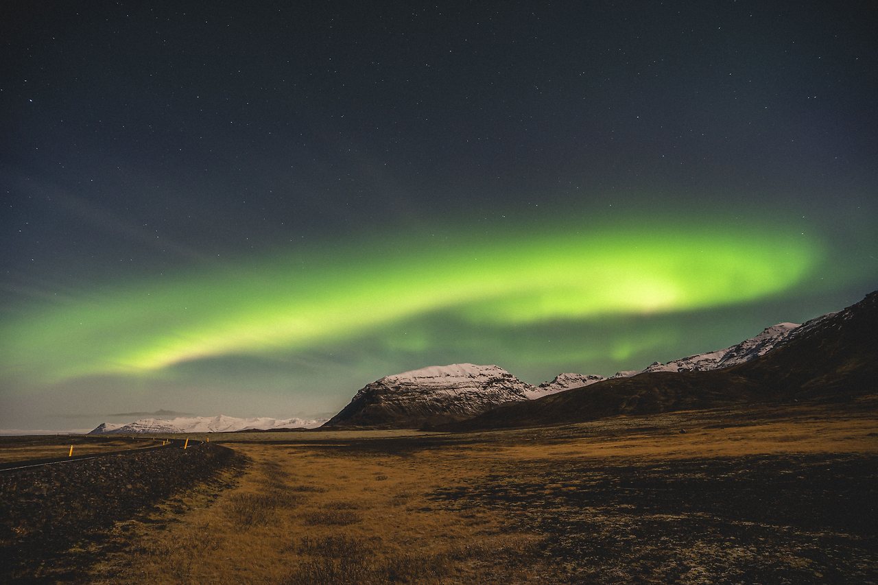 숙소에 들어가 밤이 깊어지기를 기다렸다. 빙하가 보이는 곳에서 오로라를 보고 싶다는 생각에 한 밤 중 숙소에서 35km 떨어진 곳까지 달렸다. 대략 포인트를 찍고 달리다가, 풍경이 딱 멋지게 보이는 지점에 차를 세우고 기다렸다. 사진과 달리 육안으로 보는 오로라는 좀 더 약하고 회색이 섞인 녹색에 가깝다고 한다.