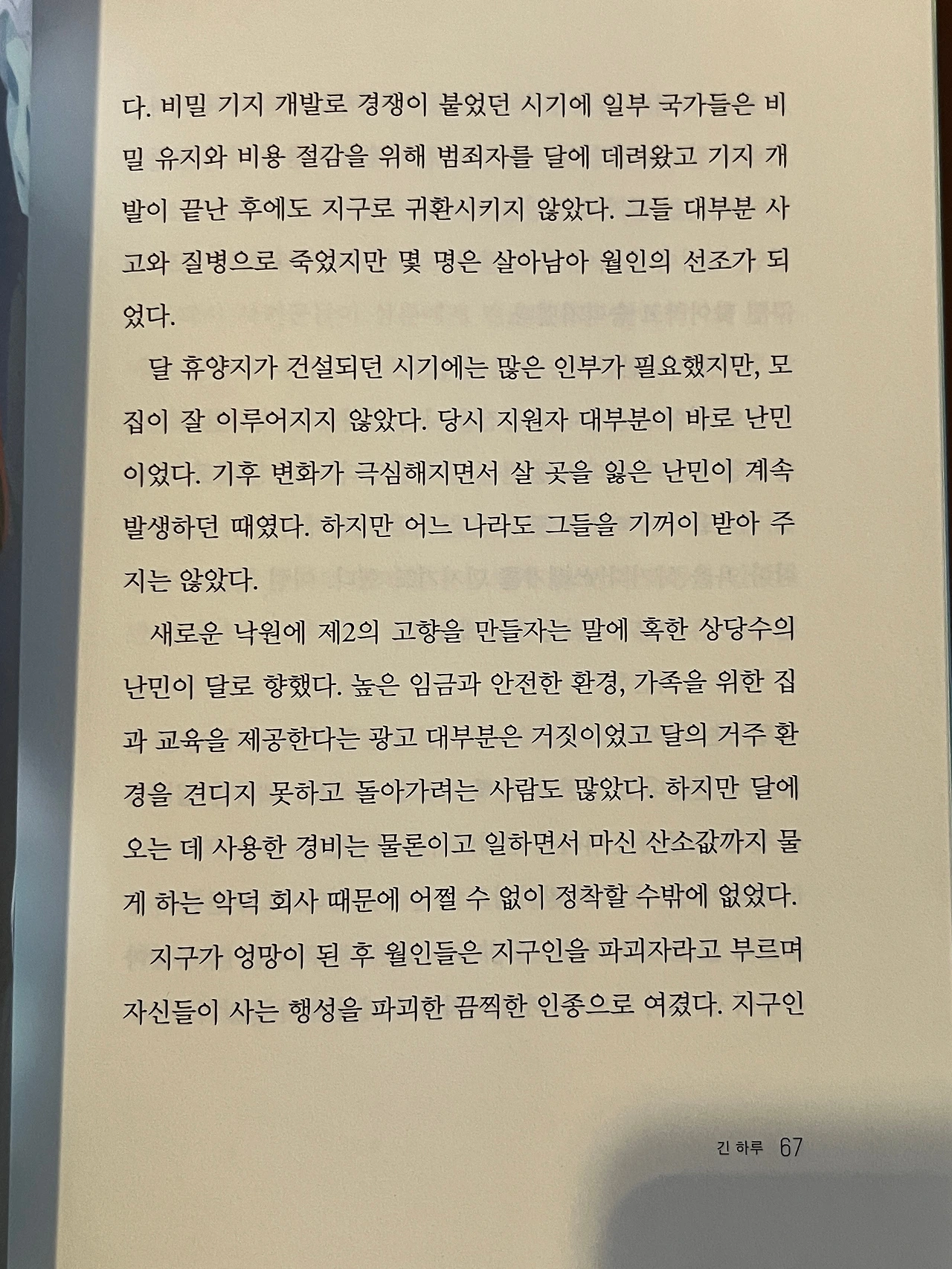 지금도 지구촌 곳곳 전쟁으로 난민이 되어 유럽 등지로 도망친 사람들에 대한 무시와 환멸, 분노와 같은 감정이 똑같이 묘사되어 있었다. 달에 사는 '월인'은 사실은 같은 인간이지만 그 땅에서 태어나 영주권을 가진 사람들이라고 해서 '지구인'들을 받아들이지 않는다. 돌아갈 지구가 없어진 지구인들은 그대로 집을 잃은 난민이 되었다.