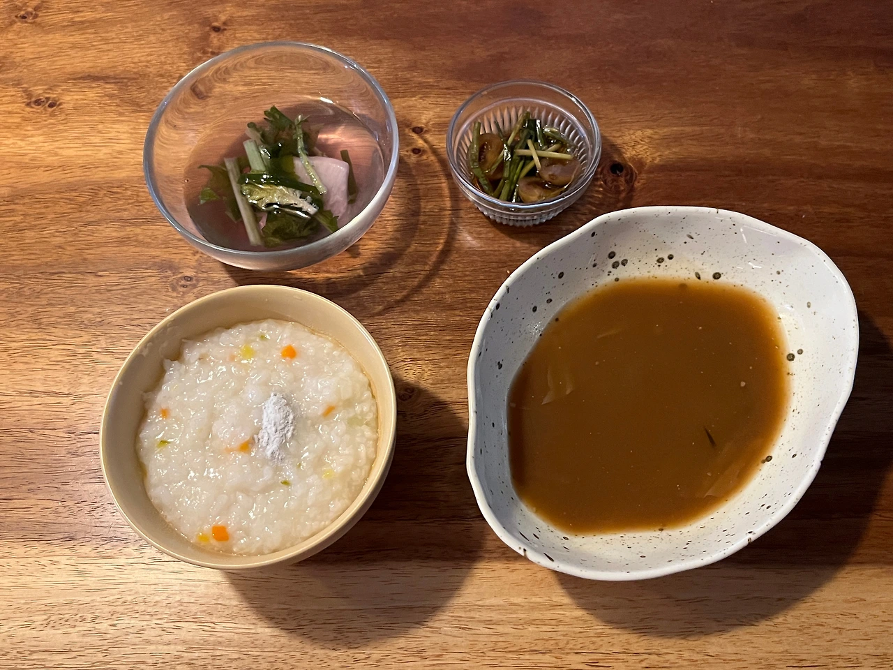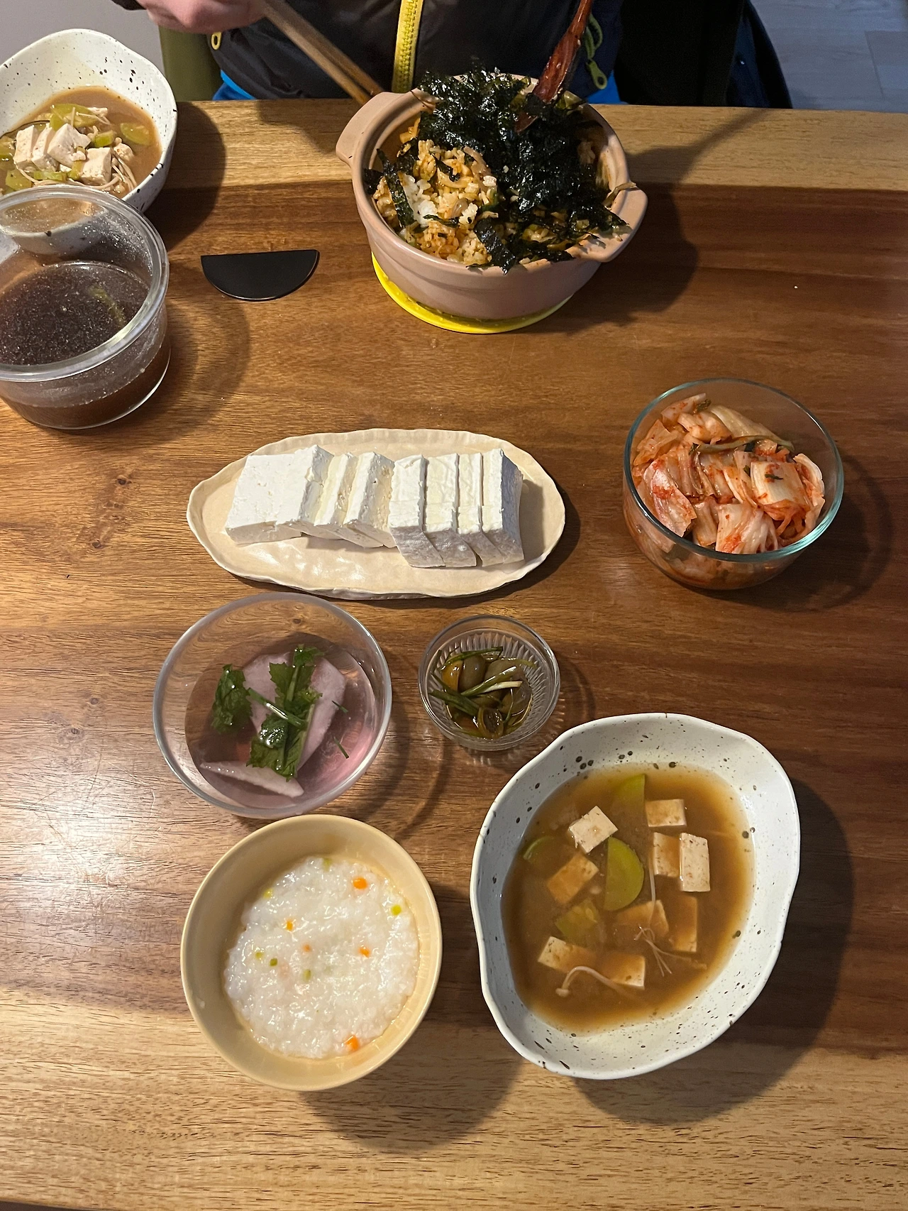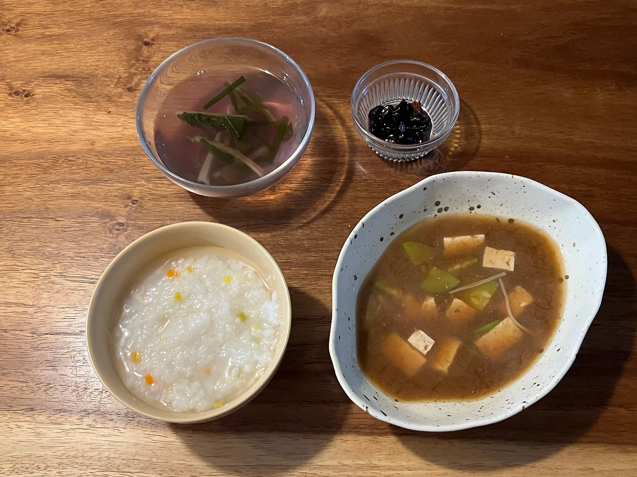 저녁은 죽 3/5 공기, 물김치, 된장국, 토마토장아찌, 그리고 두부 한 조각.