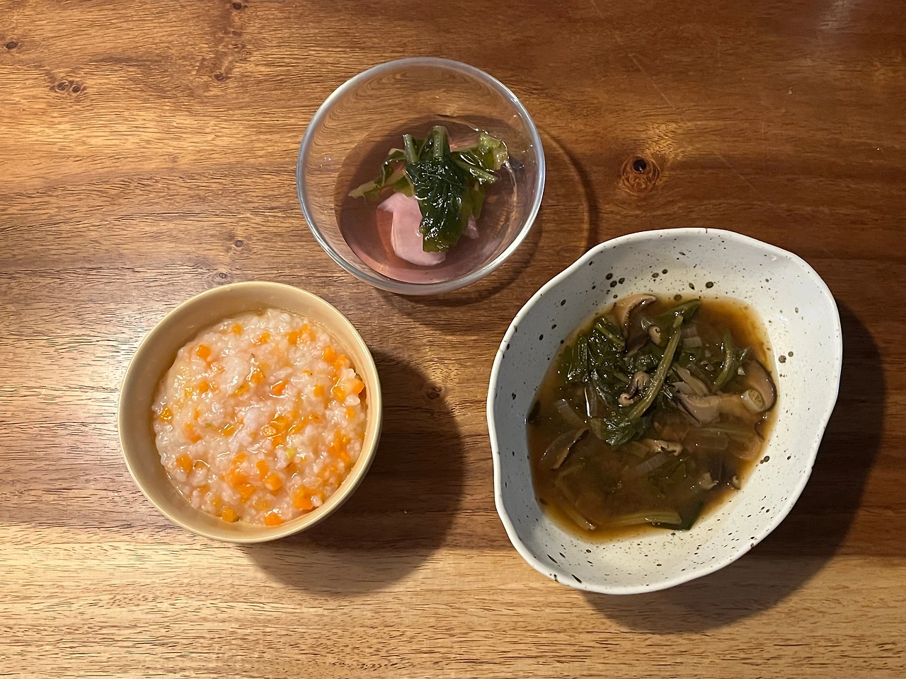 아침은 당근죽 4/5 공기, 물김치, 된장국.