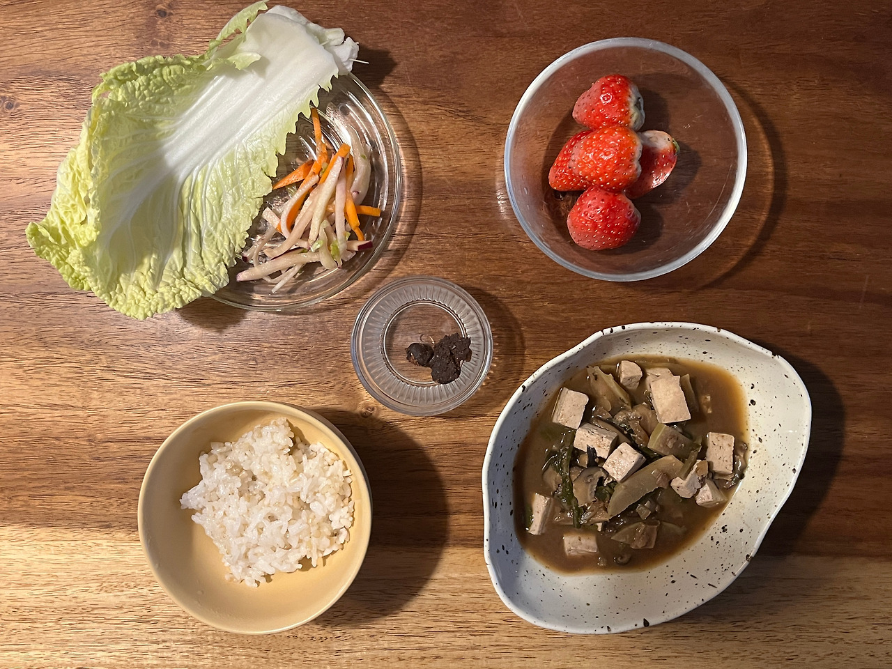 아침은 밥 3/5 공기, 된장국, 당근콜라비배추 초절임, 생배추와 된장, 딸기.