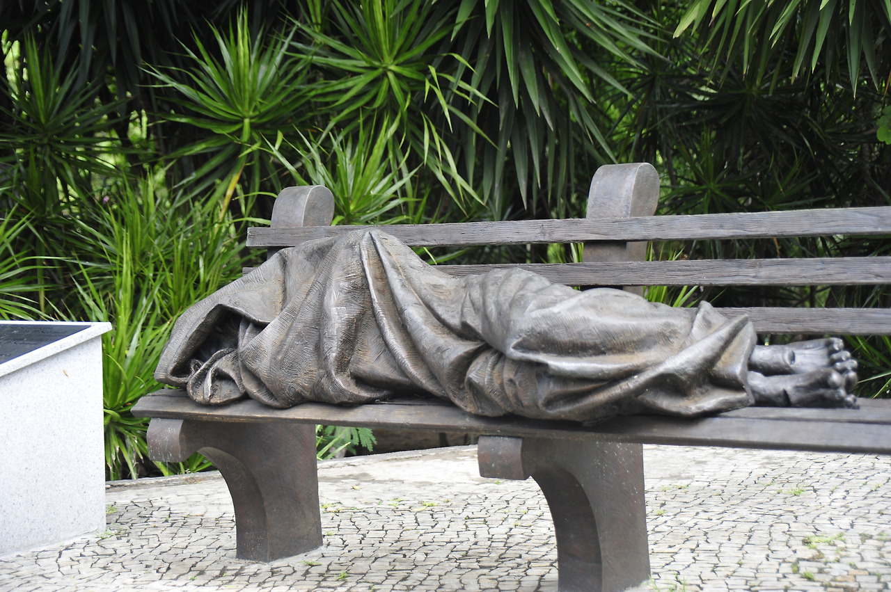남편의 말에 고개를 돌리니 거무튀튀한 색의 원뿔 모양 건물이 눈에 들어온다. 세상에서 제일 예쁜 성당이라는 말보다 더 강하게 끌어당긴다. 제일 못생긴 성당 앞 벤치에 낡고 더러운 헝겊을 돌돌 감고 노숙자 한 명이 드러누워 있다. 브라질에서는 낯설지 않은 풍경이다. 새삼스러울 것도 없어 노숙자를 스치듯 보는데 이상하다.