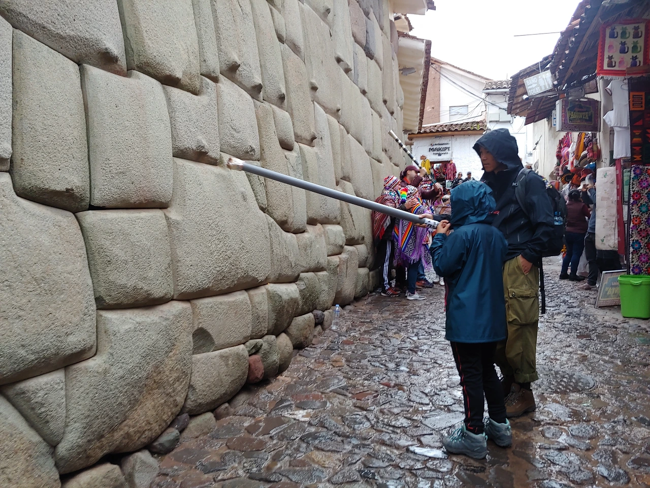 쿠스코의 아르마스 광장은 천막으로 덮여 있다. 크리스마스이브 행사의 일환인 원주민들의 노점상이다. 갑자기 쏟아진 비를 피하려고 원주민과 관광객들이 한데 얽혀있는 처마로 뛰어든다.