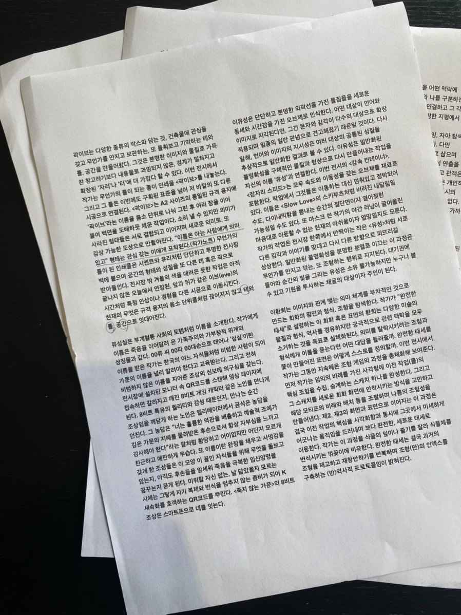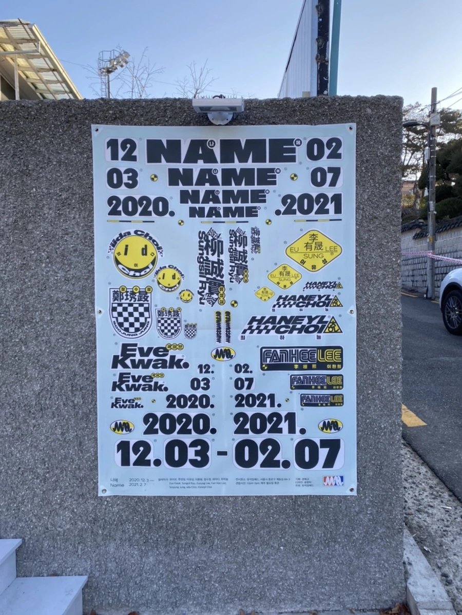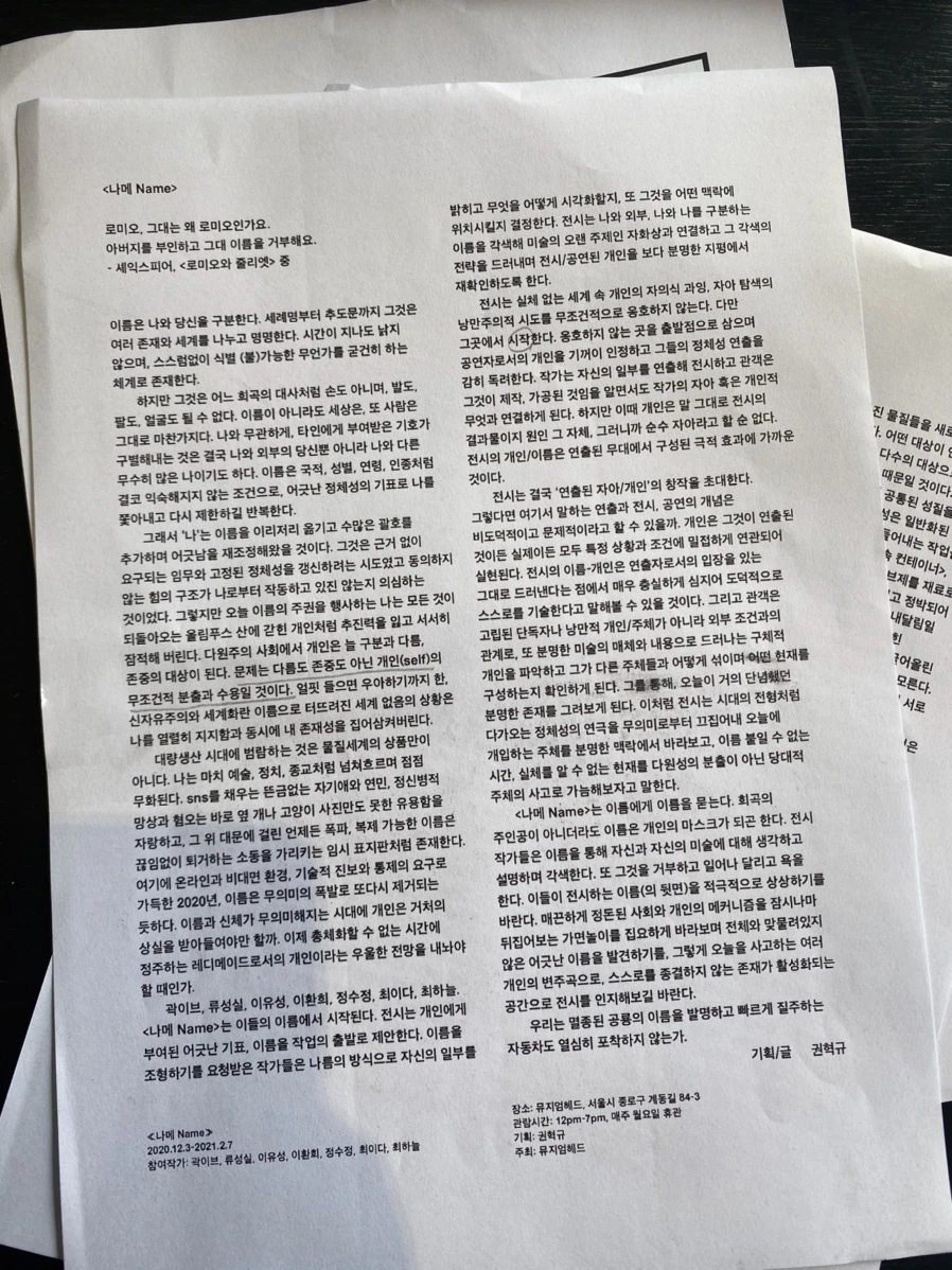 종로에 위치한 갤러리 뮤지엄헤드의 오픈전 <나메NAME>에 다녀왔다. 곽이브, 류성실, 이유성, 이환희, 정수정, 최이다, 최하늘 총 7명의 작가가 참여한 전시 <나메NAME>는 이름으로부터 시작된 물음을 이름으로 끝맺는다. 이름은 단순한 문자 그 이상의 것들을 내포한다. 사람은 이름으로 태어나고 이름으로 죽는다. 전시 작가들은 실체가 없는 ‘이름’이라는 것을 연출하고 전시하며 가시적으로 드러낸다. 기획자의 말을 빌리자면 이 작가들은 이름을 통해 자신과 자신의 미술에 대해 생각하고 설명하며 각색한다. 또 그것을 거부하고 일어나 달라고 욕을 한다. 이는 곧 작가와 관객을 연결하며 관객으로 하여금 이들이 전시하는 이름과 그 이름의 뒷면을 적극적으로 상상하도록 유도한다.