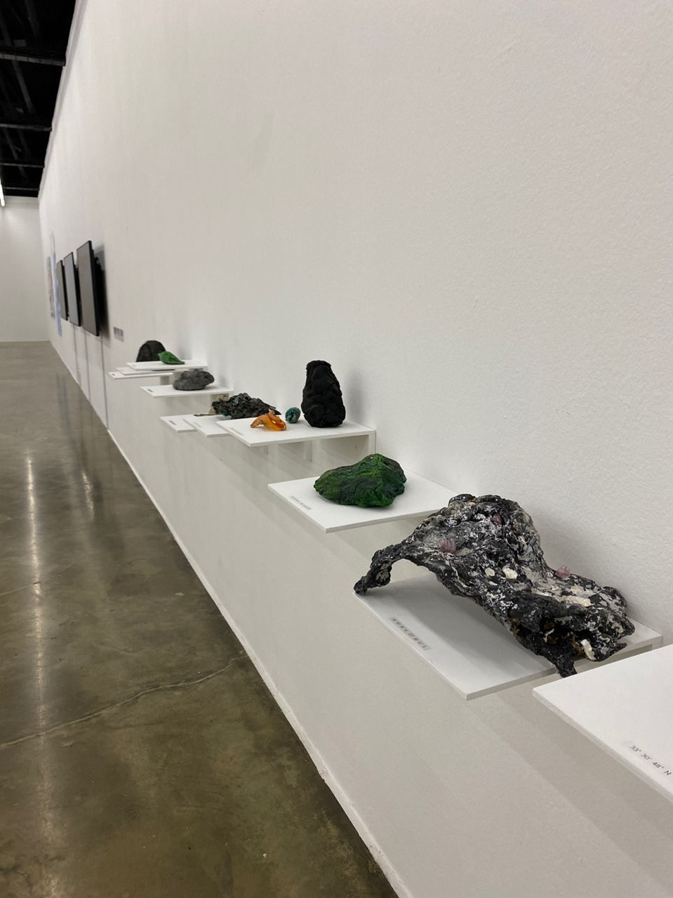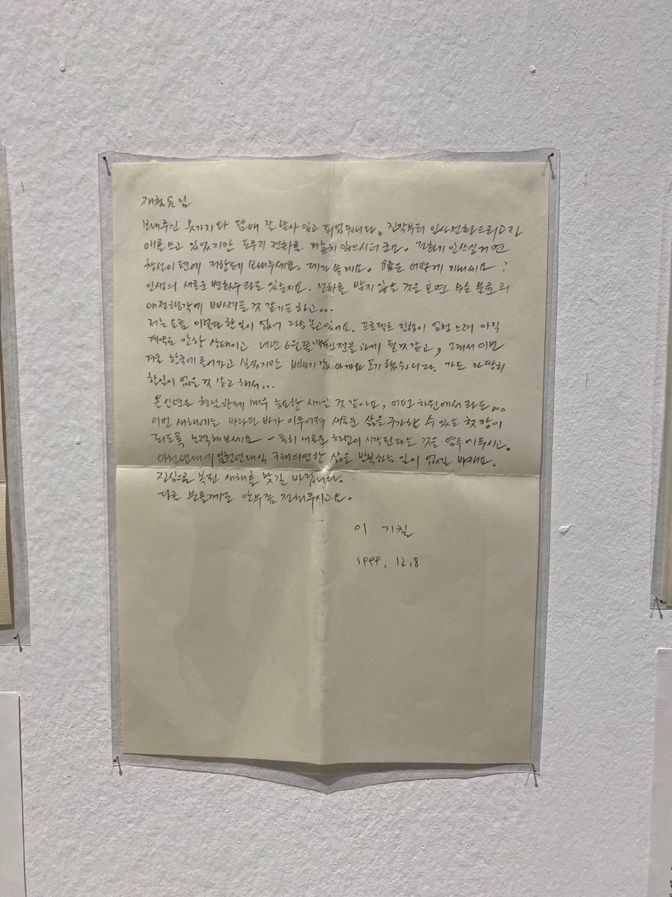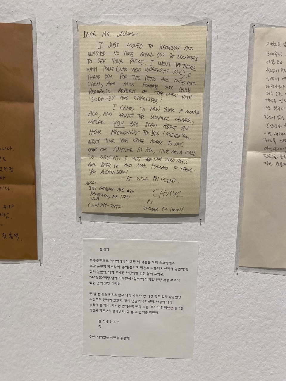 제1전시실 입구는 지인들이 그에게 보낸 편지와 엽서로 이루어져 있다. 다른 사람의 편지를 몰래 읽는 것만큼 은밀한 일이 있을까? 한동안 편지 내용을 들여다보았다. 편지 속에는 왜 이렇게 연락이 되지 않느냐는 푸념과, 브루클린에 방문하자마자 너의 작품을 보러 소크라테스 조각공원에 다녀왔다는 소식, 함께 담배 피우며 마시던 소다가 그립다는 추억팔이, 러시아에서 작업을 하기 위해 있다는 소식과 더불어 네가 올해 모리셔스로 작업을 하러 왔으면 좋겠다는 애정 섞인 끝맺음말 등이 녹아있다.
