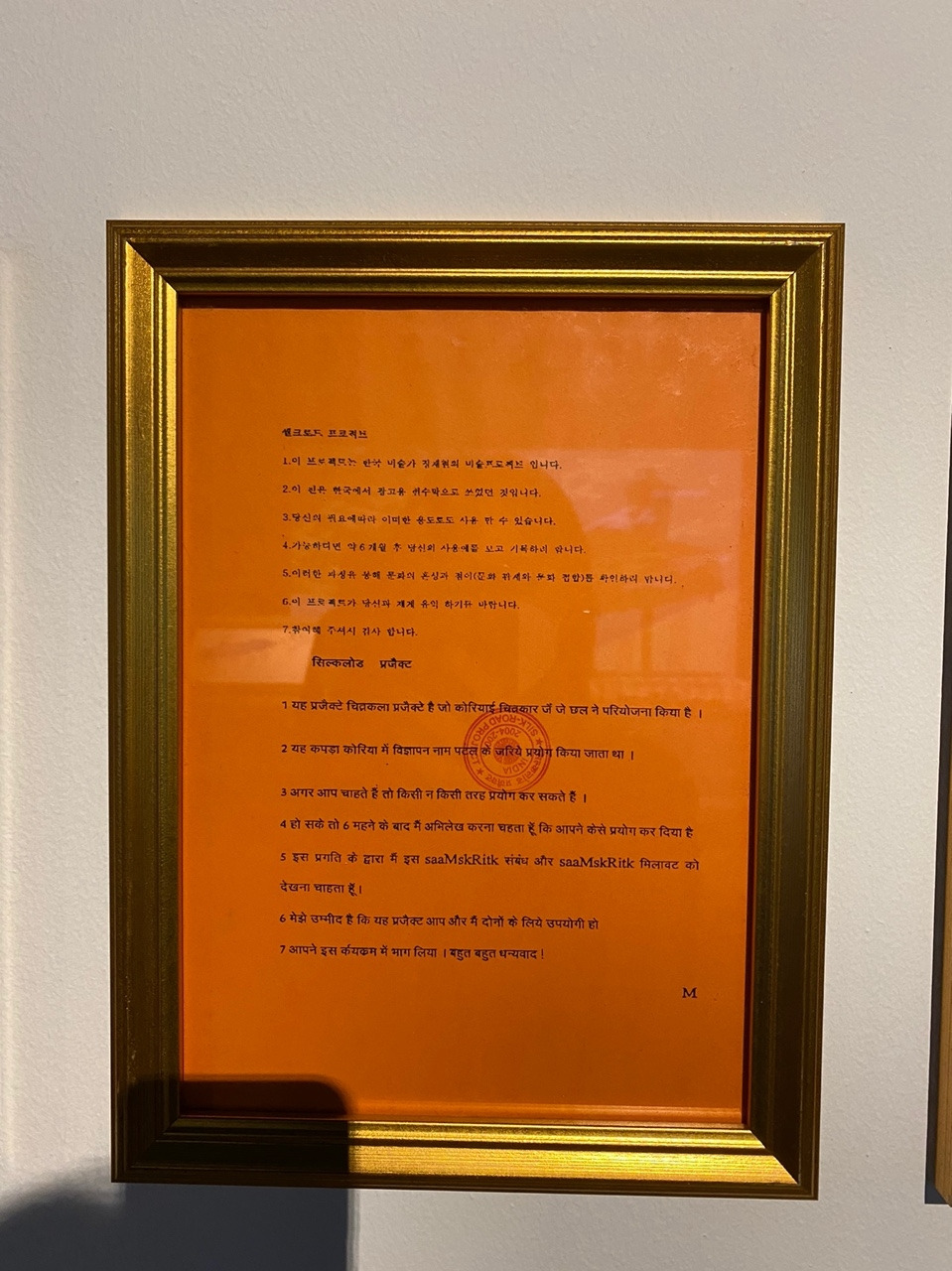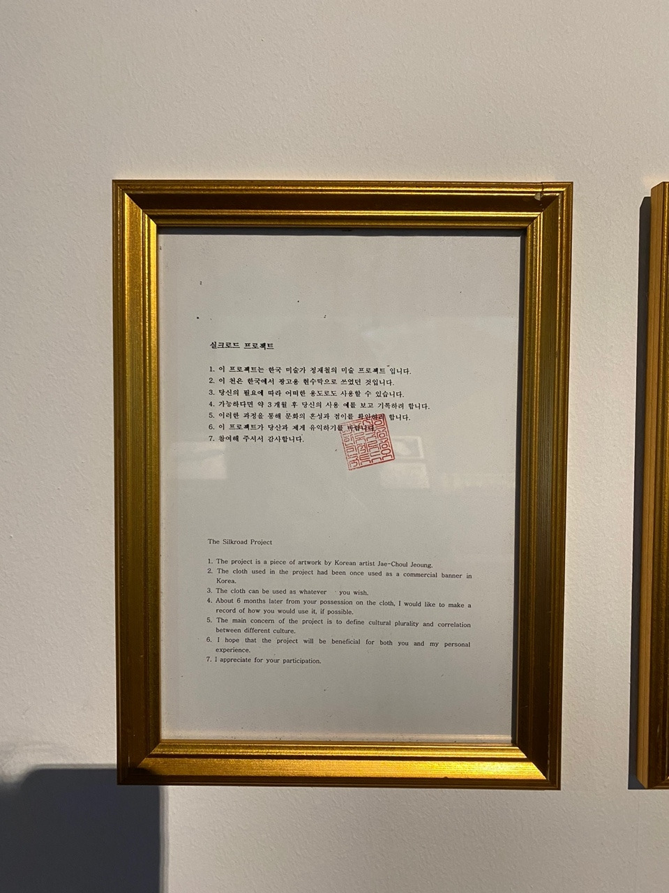전시의 제목인 '사랑과 평화'는 <실크로드 프로젝트>의 마지막 여행지였던 영국 런던의 팔리아먼트 광장 (Parliament Square) 반전시위캠프의 천막 위에 적은 문구다. 작가의 작업에서 빈번하게 발견되는 사랑, 그리고 평화는 사회 참여적 프로젝트를 통해 지향했던 공동의 지평을 드러낸다.